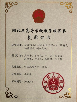 系党支部支持与积极参与探索软件专业人才实践模式创新,本专业整体执教水平明显提高,涌现一批优秀教师。。由本专业团队申请的“地学信息化特色软件工程人才阶梯式培养模式创新实践” 2018年获第八届湖北省高等学校教学成果奖二等奖。参与的“地理信息类专业应用型人才培养3332教学体系的构建与实践” 2018年获国家级教学成果二等奖。通过教师团队的打磨罗忠文老师2013年获评校级教学名师;张建波等三位老师先后获得金石奖教金;2018年张德军老师获校青年讲课比赛一等奖;2015年赵一石等老师获“最受学生欢迎老师”称号;2018年叶亚琴老师获得“最受学生欢迎课程奖”称号。方芳等六位老师获多次学校教学质量评价优秀奖,获奖人次在全校表现突出,本专业整体呈现精心教学的良好风气。
