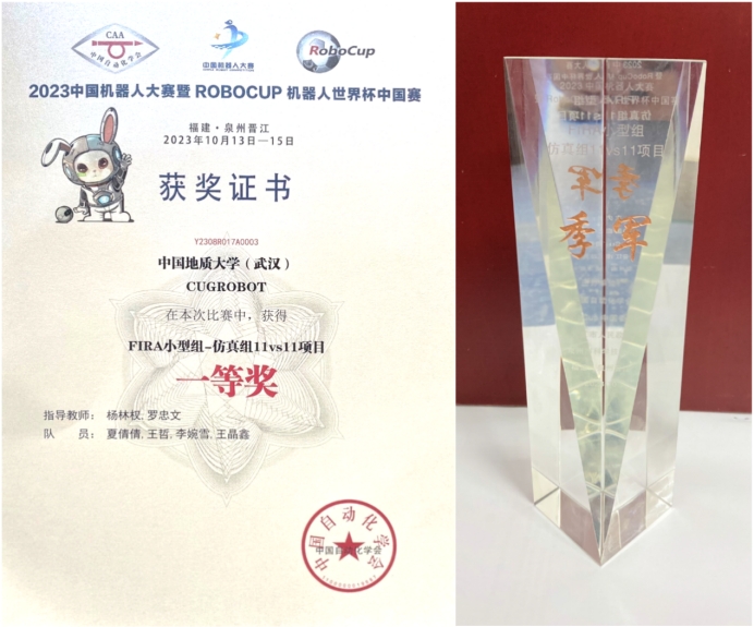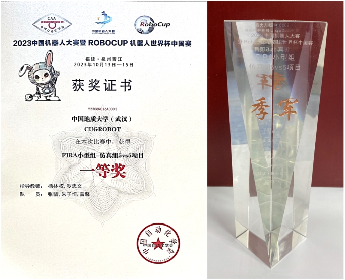 2023年中国机器人大赛暨RoboCup机器人世界杯中国赛(以下简称:中国机器人大赛)落下帷幕,世界杯CUGROBOT代表队参加。经过激烈角逐,杨林权、罗忠文两位老师带领研究生张翡、夏倩倩和本科生朱子恒、王哲、曾馨、李婉雪、王晶鑫获得FIRA仿真组5vs5项目季军、一等奖,FIRA仿真组11vs11项目季军、一等奖。比赛过程历历在目,记忆犹新。