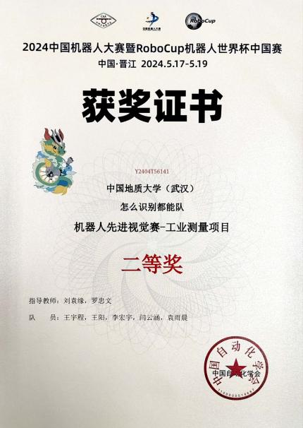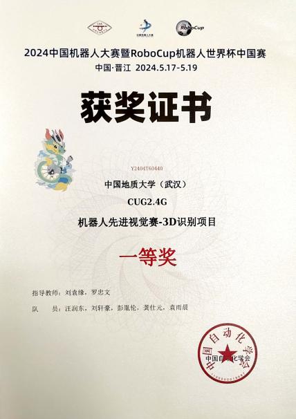 “2024年中国机器人大赛暨RoboCup机器人世界杯中国赛”在福建晋江国际会展中心落下帷幕。世界杯刘袁缘老师、罗忠文老师指导两支学生团队参加先进视觉赛项。经过激烈角逐,由汪润东、刘轩豪、彭胤伦、龚仕元、袁雨晨组成的CUG2.4G队获先进视觉赛3D识别项目一等奖,由王宇程、王阳、李宏宇、闫云涵、袁雨晨组成的怎么识别都能队获得先进视觉赛工业测量项目二等奖,这是世界杯连续在该赛事斩金夺银。两支团队回忆比赛历程,将奋斗故事与成长收获分享给大家。