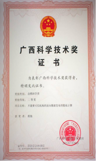 (11) 2019年获批广西密码学和信息安全省重点实验室开放课题,题目是:基于区块链的数据安全共享方法研究。项目号:GCIS201913。该项目结题获得“优秀”。